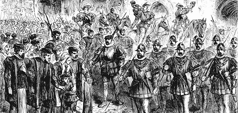 "From the Merchant Taylors' Hall began the famous cavalcade of the Archers, under their leader the Duke of Shoreditch. Consisting of 3000 Archers sumptuously apparelled, 942 whereof wore chains of gold about their necks. This splendid company was guarded by whifflers and billmen to the number of 4000, besides pages and footmen who marched through Moorfields by Finsbury where they shot for glory" (March of the archers in 1530). Read more